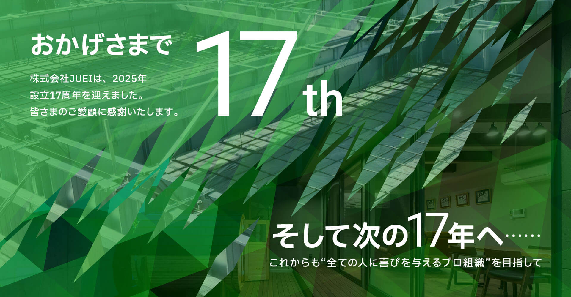 JUEIは基礎業者としてスタートし、現在では建築業まで行う総合建設業者です。今後はさらに地域貢献にも力を入れ、社員、お客様、お取引業者様、地域住民の方“全ての人”に喜んでいただけるリーディングカンパニーを目指します。